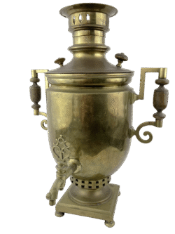 Тулово в форме «античной вазы» с перехватом в верхней части. Никелировка частично утрачена.К верхней и нижней части тулова крепятся две тонкие изогнутые ручки, скреплённые деревянными хватками, доходящие по высоте до…