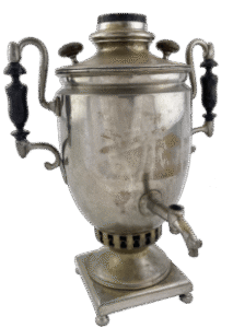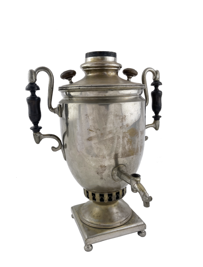 Кран с завитком на конце и гладкой розеткой в основании. Ключ крана, заглушка, крышка зольника и конфорка утеряны. Крышка с утолщением в верхней части. На крышке — затёртое клеймо: «за трудолюбие Ф.ИВАНА ЛОМОВА ВЪ ТУЛъ». Самовар куплен на eBay за $100.