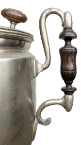 К верхней и нижней части тулова крепятся две тонкие изогнутые ручки, скреплённые деревянными хватками, доходящие по высоте до уровня крышки.
