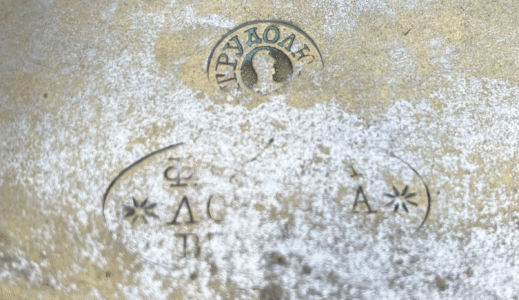 На каждой ручке — клеймо: «СМ». Основание квадратное, на четырёх сплюснутых ножках в форме шариков. Поддувало с фигурными прорезями.