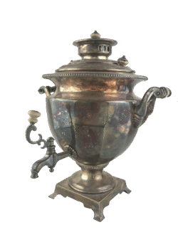 The body is silver-plated and shaped like a faceted vase, with a neck in the upper part and a rim decorated with raised beading. The draft opening is absent. The base is square, set on four legs. The handles consist of two metal plates connected by carved wooden holders. The spigot is four-sided, with a decorative rosette at its base. The tap key is shaped like a branch with a wooden knob. The lid is stepped, with two wooden grips. The fire grate has three decorative cutouts. The plug is stepped, with a wooden knob. The set includes a chimney with a wooden handle. A stamp reading “MWF” is located on the lower part of the base. The samovar was manufactured in Germany and purchased on eBay.