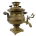 The body is shaped like a turnip, chased with stylized curved lines. The base is round and decorative, with legs extending from it. The draft opening has decorative cutouts. The handles are made of two ornate metal plates connected by wooden grips and are attached to the body with raised rosettes. The rim of the body is decorated with a relief pattern resembling inverted stylized hearts. The spigot has an elongated raised rosette at its base and ends with a shaped spout. The tap key is made in the form of a branch with a wooden knob. The lid is stepped, with two wooden grips and a steam vent. The fire grate is cast, with decorative cutouts. The plug is stepped, with a wooden knob. The lid bears a legible stamp: «въ ТУЛIЪ М.Е.ВАНЫКИНА». The samovar was purchased on eBay.