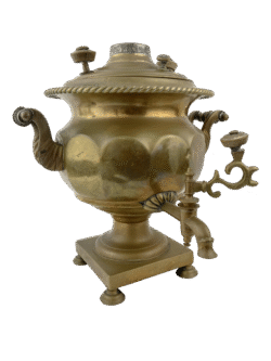 The body is shaped like a vase, chased with spoon impressions, with a constriction at the top and a rim decorated with a braided relief pattern. The samovar has no draft opening and stands on a square base with four stepped round legs. The handles are made of two decorative metal plates connected by carved wooden grips. The spigot is four-sided, with a “repeyek” rosette at the base and a shaped spout. The tap key is made in the form of a branch with a wooden knob. The lid is stepped, with a steam vent and two wooden grips. The fire grate and plug are missing. A chimney is included, though its wooden handle is missing. The front face of the base bears the stamp: «ЯКОВЪ ЧИГИНСКИЙ ВЪ ТУЛIЪ». The samovar was purchased at an auction held by Clars Auction Gallery in Oakland, CA in 2021.