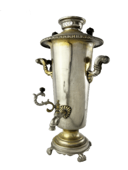 The body is shaped like a goblet and has a smooth surface. The samovar has no draft opening and stands on a round stepped base with four stepped legs. The rim is decoratively shaped. The handles consist of two ornate metal plates connected by wooden grips. The spigot is four-sided and attached to the body with a fluted triangular rosette. The tap key is shaped like a branch with a wooden knob. The lid is stepped, with two wooden grips (replacements) and an opening for steam release. The fire grate has three decorative cutouts. The plug is missing. The lid bears the stamp: «въ ТУЛIЪ М.Е.ВАНЫКИНА». The samovar was purchased at Goodwill in 2022. A note attached to the samovar stated that the previous owners were Fanny and Nathan Kerson, who emigrated from Russia in the early 1900s.