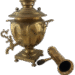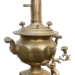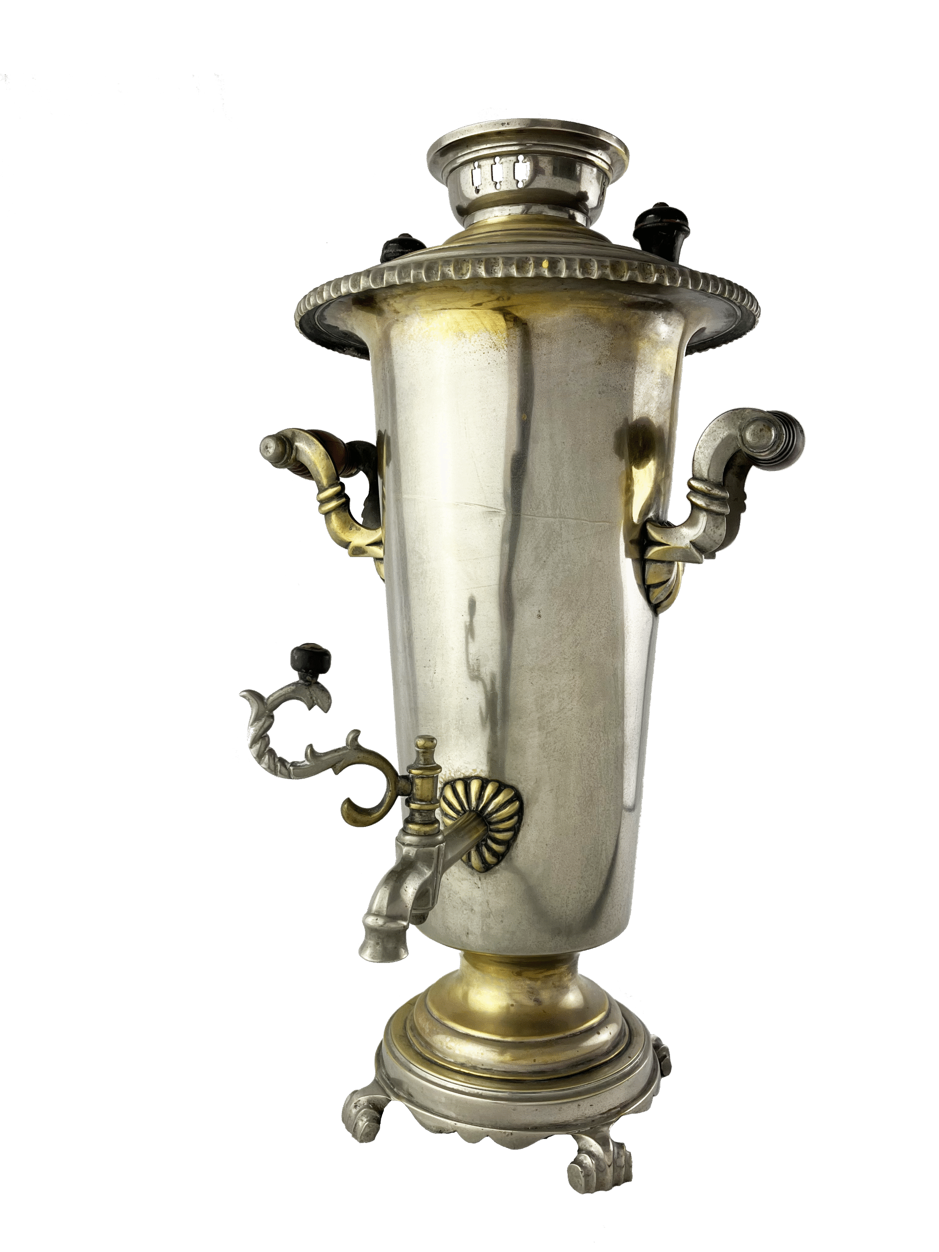 The body is shaped like a goblet and has a smooth surface. The samovar has no draft opening and stands on a round stepped base with four stepped legs. The rim is decoratively shaped. The handles consist of two ornate metal plates connected by wooden grips. The spigot is four-sided and attached to the body with a fluted triangular rosette. The tap key is shaped like a branch with a wooden knob. The lid is stepped, with two wooden grips (replacements) and an opening for steam release. The fire grate has three decorative cutouts. The plug is missing. The lid bears the stamp: «въ ТУЛIЪ М.Е.ВАНЫКИНА». The samovar was purchased at Goodwill in 2022. A note attached to the samovar stated that the previous owners were Fanny and Nathan Kerson, who emigrated from Russia in the early 1900s.
