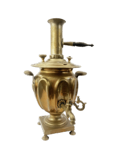The body is shaped like a vase and chased with concave spoon impressions. The samovar has no draft opening and stands on a square base. One side of the chimney is flat. The handles are shaped like stylized shells and are attached to the body with fluted rosettes. The spigot has a raised rosette at its base. The tap key is shaped like a branch. The lid is stepped, with two wooden grips (replacements) and a steam vent. The fire grate and the plug are missing. The lid bears a partially worn stamp: «Н. Маликов». The set includes a chimney pipe with a wooden handle. The samovar was purchased at an online auction in 2022.