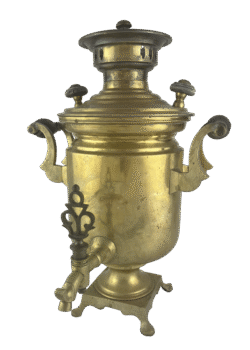 The body has the shape of a “jar” with a stepped constriction in the upper part. The base is square. The samovar has no ash-pit (поддувало). The handles are flat with wooden grips. The spigot has a curled tip and a smooth rosette at the base. The spigot key is shaped like a stylized “heart.” The lid is stepped, with two wooden knobs and a steam vent. The burner ring has three decorative cutouts. The plug has a wooden finial. On the lid there is an oval mark: “ФАБРИКА А. П. ЗАХРЯПИНА въ ПереславлIъ.”The ash drawer is missing. The samovar was purchased on OfferUp in 2018 from a private seller.