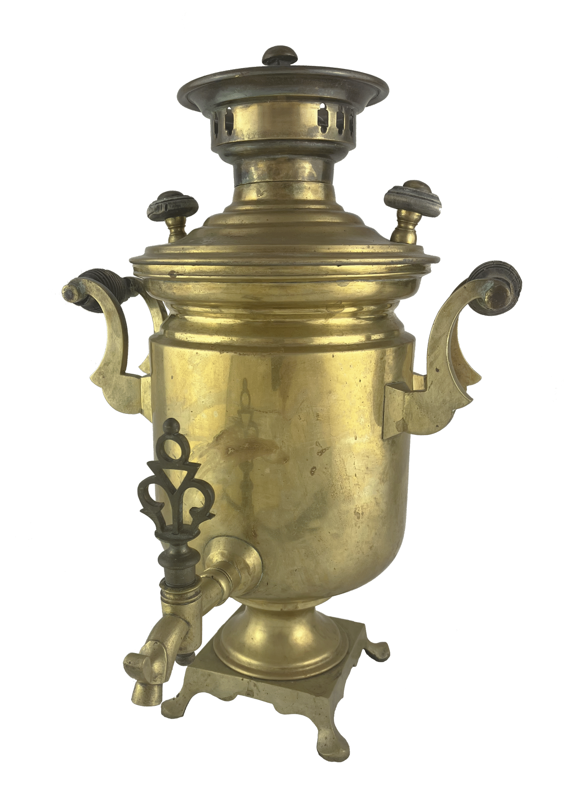 The body has the shape of a “jar” with a stepped constriction in the upper part. The base is square. The samovar has no ash-pit (поддувало). The handles are flat with wooden grips. The spigot has a curled tip and a smooth rosette at the base. The spigot key is shaped like a stylized “heart.” The lid is stepped, with two wooden knobs and a steam vent. The burner ring has three decorative cutouts. The plug has a wooden finial. On the lid there is an oval mark: “ФАБРИКА А. П. ЗАХРЯПИНА въ ПереславлIъ.”The ash drawer is missing. The samovar was purchased on OfferUp in 2018 from a private seller.