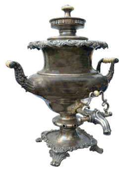 The body is shaped like a vase, widening toward the bottom. The base is decorative, with a textured surface and cast floral ornamentation, supported by four shaped outward-curving legs. The draft opening has round cutouts that are concealed beneath a cast floral border. The spigot is massive, cast, and sculpted, and is attached to the body with an ornamental rosette. The tap key is frame-shaped, pivoting, consisting of two parts connected by a bone bead (replacement). The handles are made of two rounded rods joined by carved bone grips. The upper part of the body is adorned with a cast floral border. The lid has a sculpted form and is soldered together with a pierced fire grate. The plug is topped with a carved bone knob. The samovar is silver-plated. The lid bears a stamp showing a double-headed eagle and beneath it the word «Пецъ». The samovar was purchased from the collector Mark in San Francisco, CA in 2023. At the time of purchase, the spigot was detached from the body.