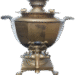 The body is shaped like a vase, widening toward the bottom. The base is decorative, with a textured surface and cast floral ornamentation, supported by four shaped outward-curving legs. The draft opening has round cutouts that are concealed beneath a cast floral border. The spigot is massive, cast, and sculpted, and is attached to the body with an ornamental rosette. The tap key is frame-shaped, pivoting, consisting of two parts connected by a bone bead (replacement). The handles are made of two rounded rods joined by carved bone grips. The upper part of the body is adorned with a cast floral border. The lid has a sculpted form and is soldered together with a pierced fire grate. The plug is topped with a carved bone knob. The samovar is silver-plated. The lid bears a stamp showing a double-headed eagle and beneath it the word «Пецъ». The samovar was purchased from the collector Mark in San Francisco, CA in 2023. At the time of purchase, the spigot was detached from the body.