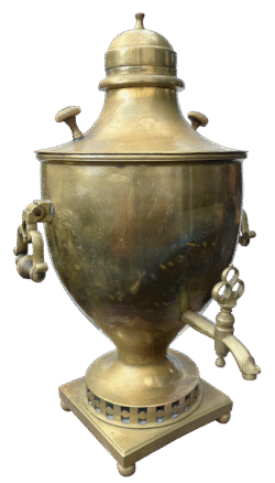 The samovar is known as “Skifon.” The body is shaped like a goblet, widening toward the top. The base is square, supported by four flattened ball-shaped legs. The draft opening, which transitions into the body, features decorative cutouts. The spigot ends with a curled tip; a rosette was not provided. The tap key is stylized in form. The handles hang on swivels and are connected by wooden grips. The lid is flat, with a thickened upper section and wooden handles. The fire grate is missing. The plug is spherical, fitted with a copper handle. On the lid is an engraving made with a graver: «Тула Иванъ и Назаръ Лисицыны». On the bottom of the plug is the stamp: «ЕП». The samovar was acquired from the collector Mark in San Francisco in 2023.
