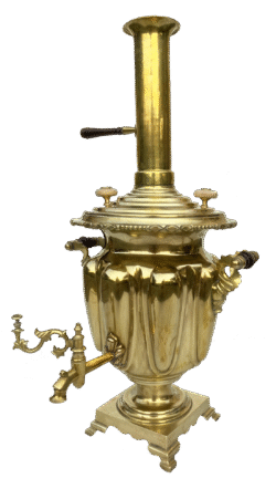 The body is shaped like a vase, decorated with spoonwork and featuring a constricted neck in the upper section. The rim is ornamented with diamond and bead motifs. The base is square with four stepped legs. The samovar has no draft opening. The handles consist of two openwork plates connected by wooden grips. The spigot is faceted, with a decorative spout and a relief rosette at the base shaped like a flower. The tap key is shaped like a branch, and the wooden knob is missing. The lid is stepped, with two wooden knobs and steam vents. The crown is missing. The chimney cap is cast, fitted with a wooden knob. A chimney tube with a wooden handle is included. The lid bears the stamp: “Самоварн. фабр. Е. А. Ваныкина в Тулѣ” with medal images on both sides. The samovar was purchased an auction in Tulsa, Oklahoma, in 2024. The spigot had been removed before acquisition.