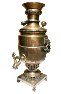 The body is shaped like a “vase” with a narrowing constriction in the upper part and a polished lower section. The rim is decorated in relief, in the form of beading. The base is square, standing on four flattened ball-shaped legs. The ash-pit is double, with shaped cutouts. The spigot is designed as a stylized fish and is mounted with a smooth rosette at the base. The spigot key consists of three interlinked rings. The lid has a thickened upper section decorated with patterned embossing. The chimney cap has patterned cutouts. The draft stopper is missing. An unreadable stamp is present on the lid. The samovar was acquired in 2025 on the eBay auction.